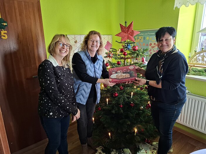 Im Dezember überreichten die Soroptimistinnen dem Freiberger Frauenschutzhaus einen Tannenbaum und Stollen für die Weihnachtsfeier. Damit kommt ein wenig Normalität in das Leben von sechs Frauen und ihren Kindern, die zur Zeit nicht in ihrem Zuhause wohnen können. Foto: privat